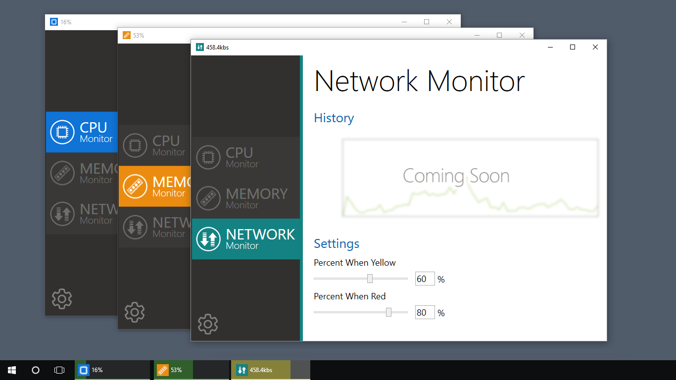 Way back in March of 2010 I wrote about a new tool I had developed with the snappy name "Windows 7 Taskbar Monitor". It was a little tool that used Windows' Performance Counter to show you what the current CPU, Memory and Network usage is: