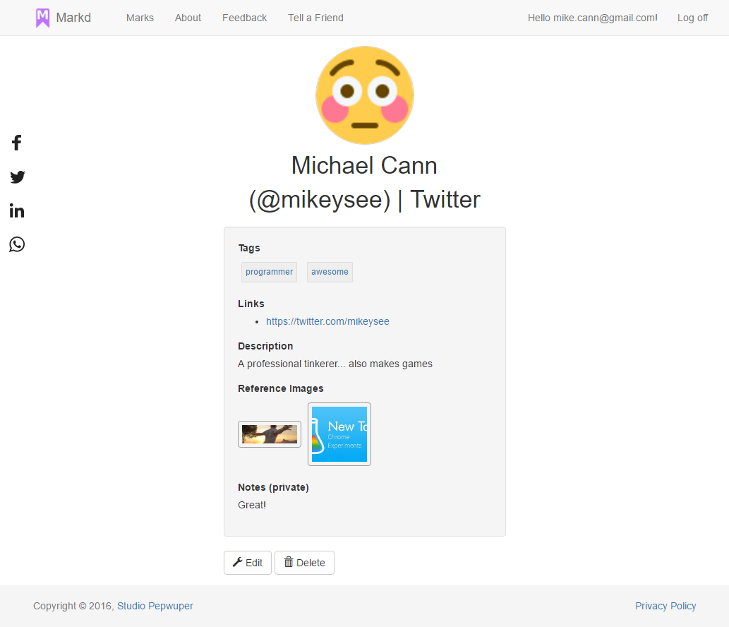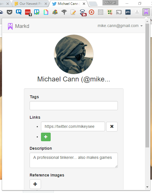 I wanted a better way to go about the process. A simple tool that would allow me to save someone into my "book of interesting people", no matter which site I find them on. I wanted it to be easy with image/description automatically filled out. I wanted it to allow me to save reference images. And I wanted it to have a simple way for me to organise and search those I've bookmarked later on. And so he contacted me to help him build out such a tool and Markd was born: