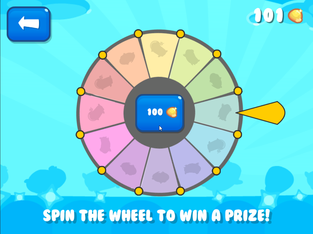 The initial spin of the wheel is hard-coded so that the player will always win an new outfit, that way I can introduce them to the purpose of earning nibbles (to get new outfits):