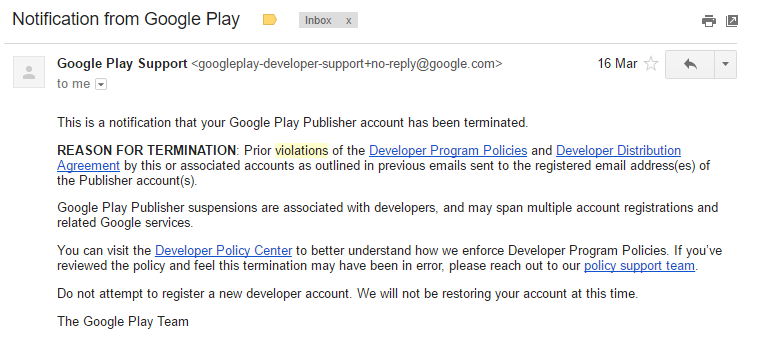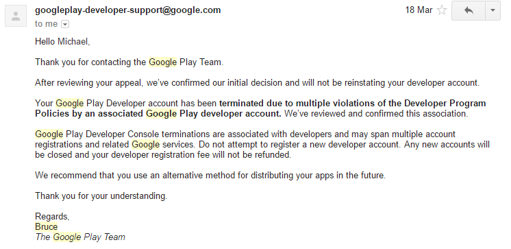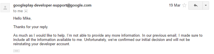 Needless to say I was shocked, worried, upset and annoyed. Not only was Credit Redeemer taken down but my entire Google Play Developer account terminated including Mr Nibbles, Mr Nibbles Forever and Ectoplasm.