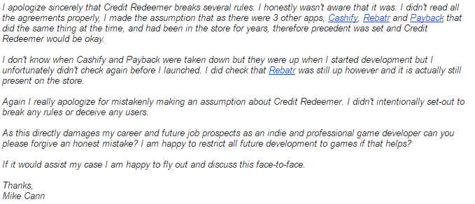 I know ignorance is no defence when it comes to the law but I assumed that as there were other apps on the store that did the same thing and had been there for years precedent had been set and is still being set as Rebatr is still on the store.
