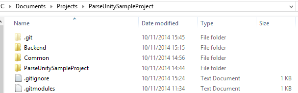 One folder for the Unity project, one for the Backend and one Common library that is shared between the two.