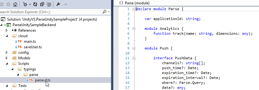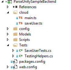 I like to use Typescript for my Parse.com backend and so the project is a Typescript project mixed with C# for unit testing. I have provided my unfinished Typescript definition file for parse.com with the project: