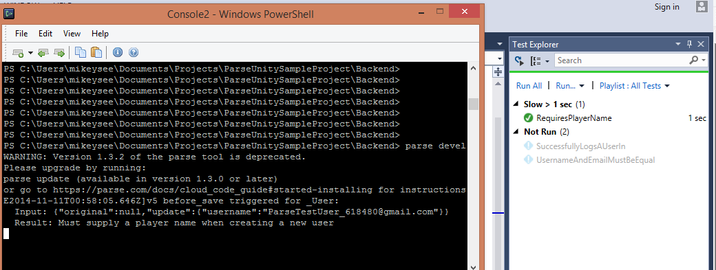 I like to use NUnit with the Parse .NET SDK for the testing because it lets us use some more advanced C# features such as async / await which the Unity SDK hasn't got access too, and more importantly it returns the server error messages (unlike Unity) which we can test against.
